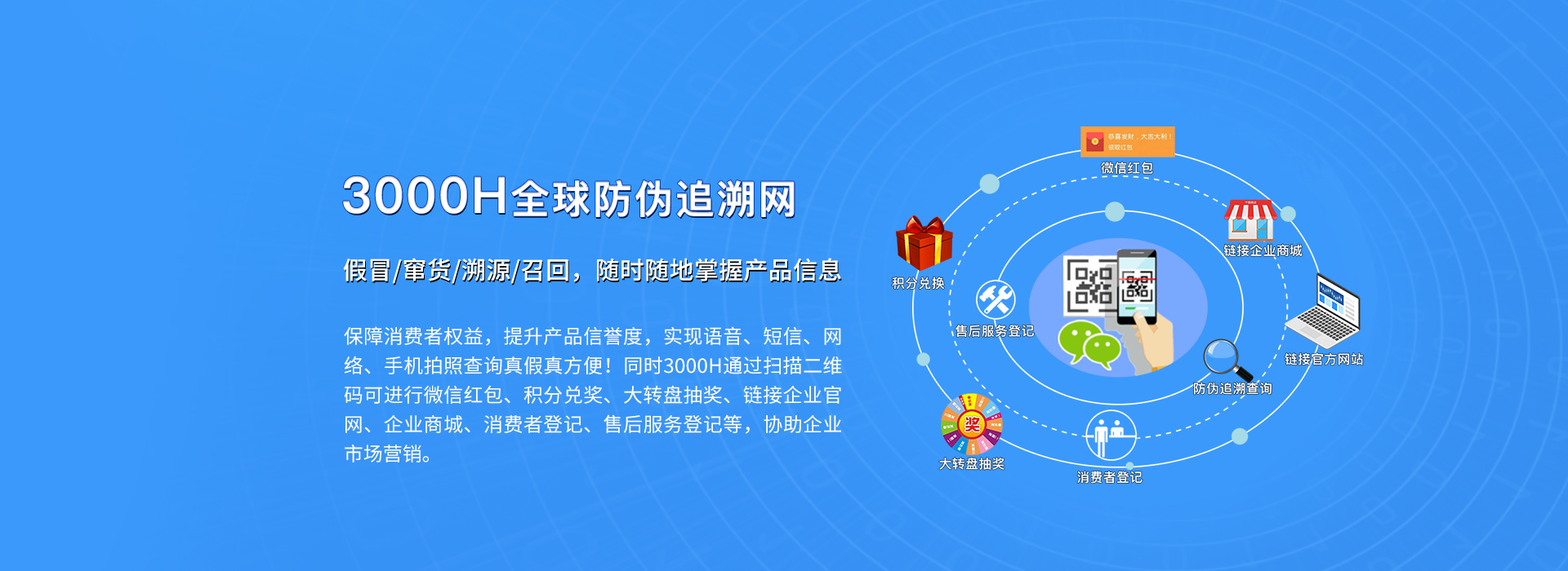 3000H 全球防伪追溯查询系统,利用现代化信息技术、网络技术、编码技术和高科技印刷技术、专业为企业提供产品数码防伪,防窜货管理,3000H平台给每个入网企业分配不同的用户名密码,为企业每一件产品赋予唯一的防伪码,实现手机拍照扫描二维码,进行防伪查询、窜货查询、微信红包、积分兑奖、大转盘抽奖、链接企业官网、企业商城、消费者登记、售后登记等,协助企业进行市场营销,提升企业品牌形象。